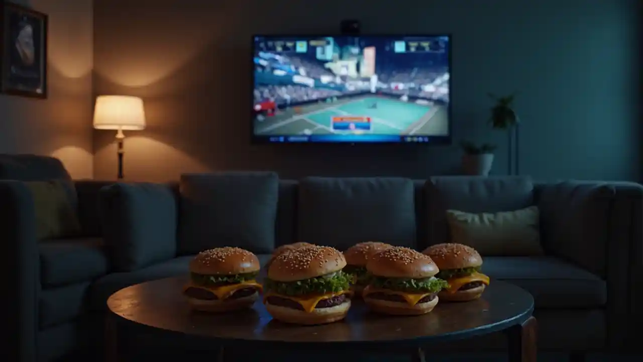 965 cheeseburgers juu ya kitanda katika chumba giza tu mwanga na screen ya TV ya wavulana wasio na kazi mchezo ambaye ana stick drift