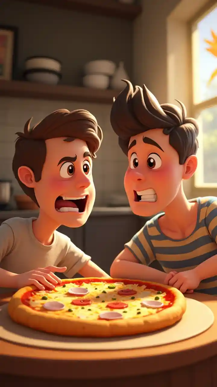 Picha ya karibu ya mtu na pizza mezani, mtu akitabasamu kwa njia ya uovu, akiwa amevaa shati lenye mistari, akiinama mbele. Pizza yenye macho na mdomo wenye kuchochea, ikionekana imeogopa. Mtu anasema "Unaonekana kama cheese. Nitakula wewe". Pizza inajibu "Hapana, tafadhali usinile". Nyuma inaonyesha jikoni la kina na vyombo, vivuli laini, highlights mkali juu ya wahusika. Kuundwa Kutumia: high frame rate animation, expressive character design, rangi tajiri, taa ya nguvu, mtindo wa katuni, programu ya uhuishaji, ubora wa hd, kuangalia asili