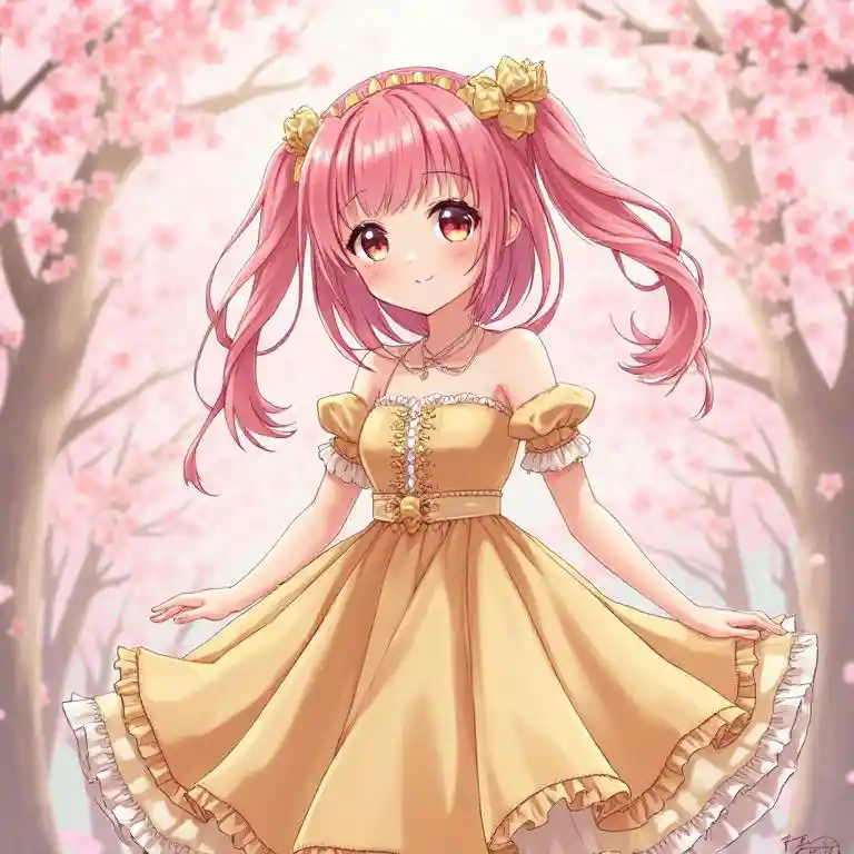 Layla(masterpiece:1.2), Best Quality,ピクシブ, fairytale girl, 1 girl, Cherry rangi ya nywele, Sakura rangi ya macho, Gold Dress, Lolita Fashion, Cherry Blossom Theme
