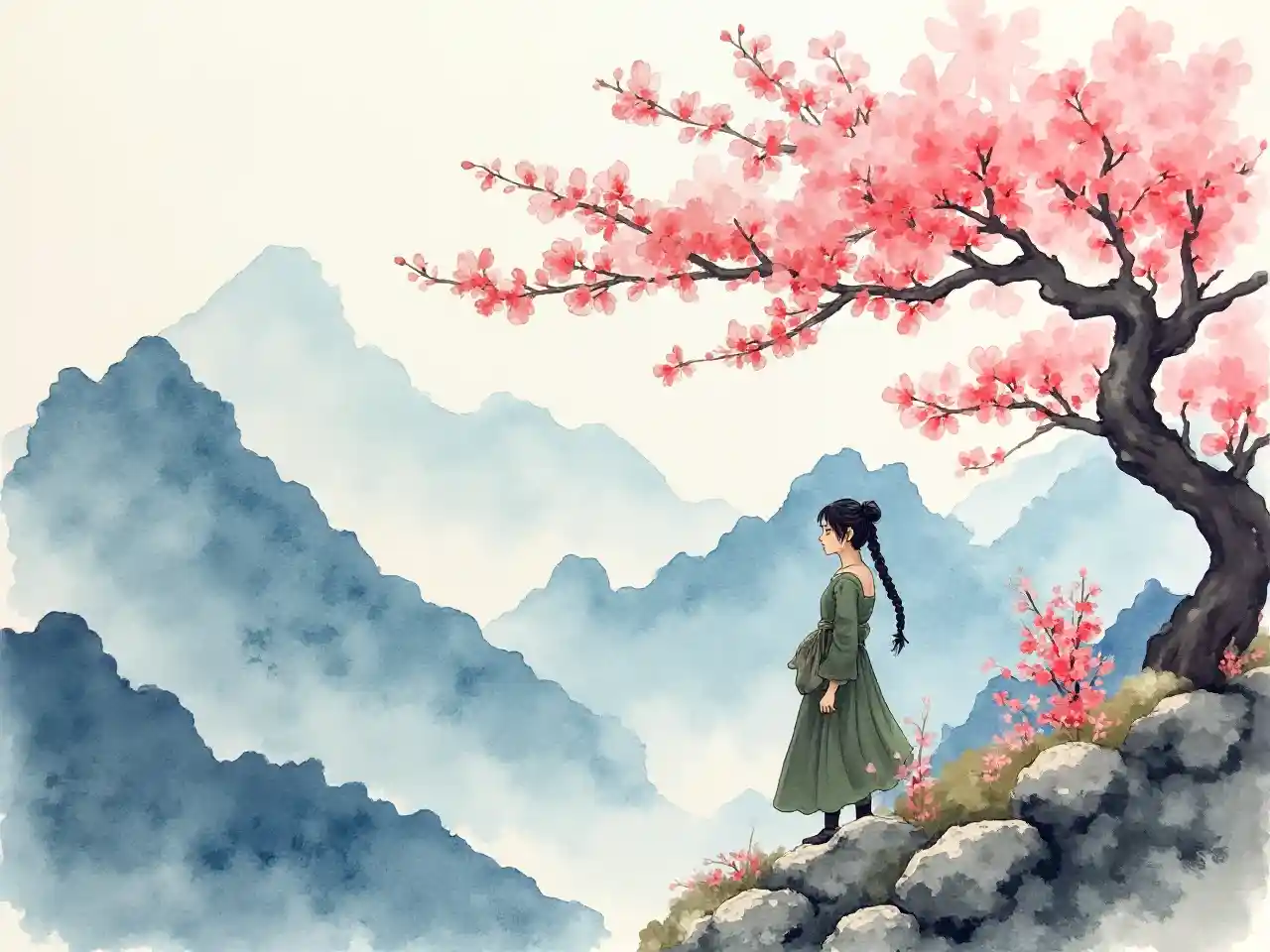 uchoraji wa rangi ya maji na mandhari ambayo ina mti wa cherry, na milima nyuma, ikikumbusha wakati, na katika kona mwanamke anayefikiria, nyuma ya mti wa cherry, ikikumbusha wakati
