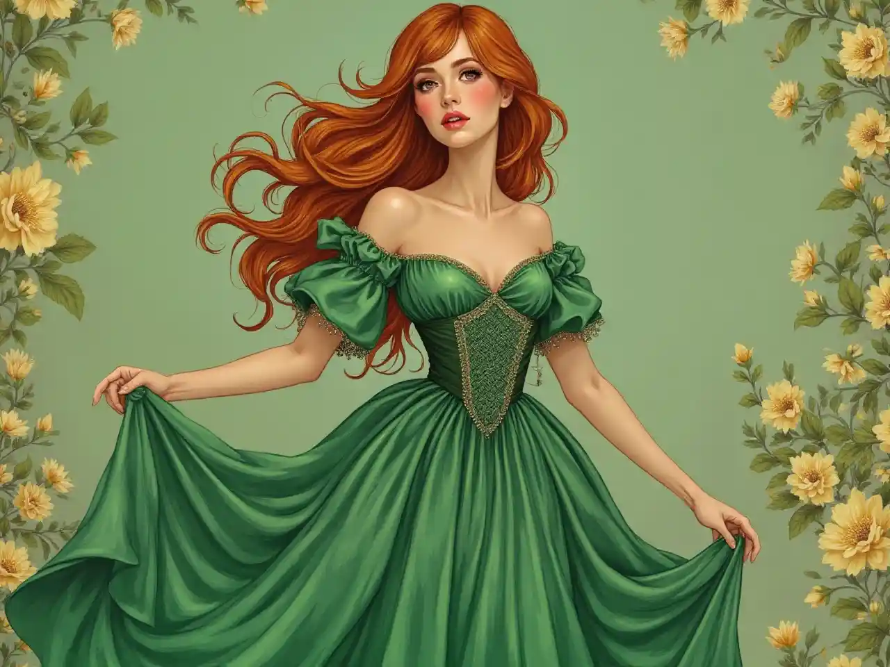 GrimMichael Cheval style illustration, ya mwanamke wa miaka ishirini, nzuri sana, sawa na Veronica Castro, amevaa mavazi mazuri ya kijani.