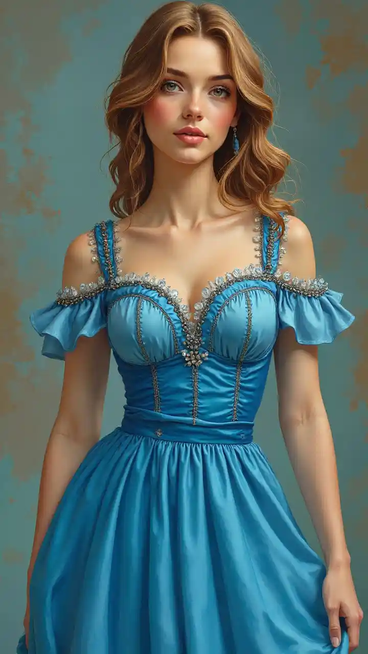 ANNAMichael Cheval style illustration, ya mwanamke wa miaka ishirini, nzuri sana, sawa na Veronica Castro, amevaa mavazi mazuri ya bluu.