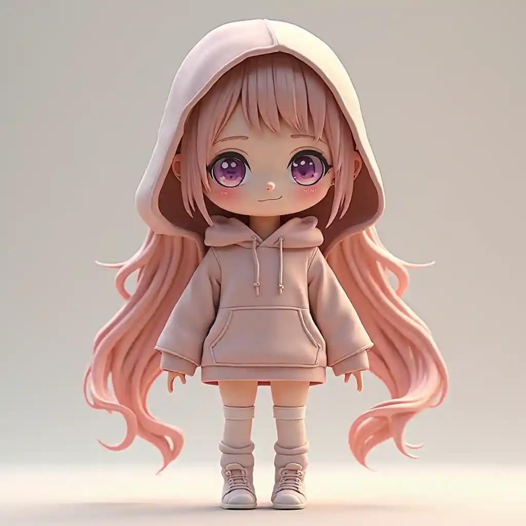 Chibi msichana na nywele ndefu kuvaa oversized hoodie na mguu soksi 3D rendering ultra quality hyperrealism