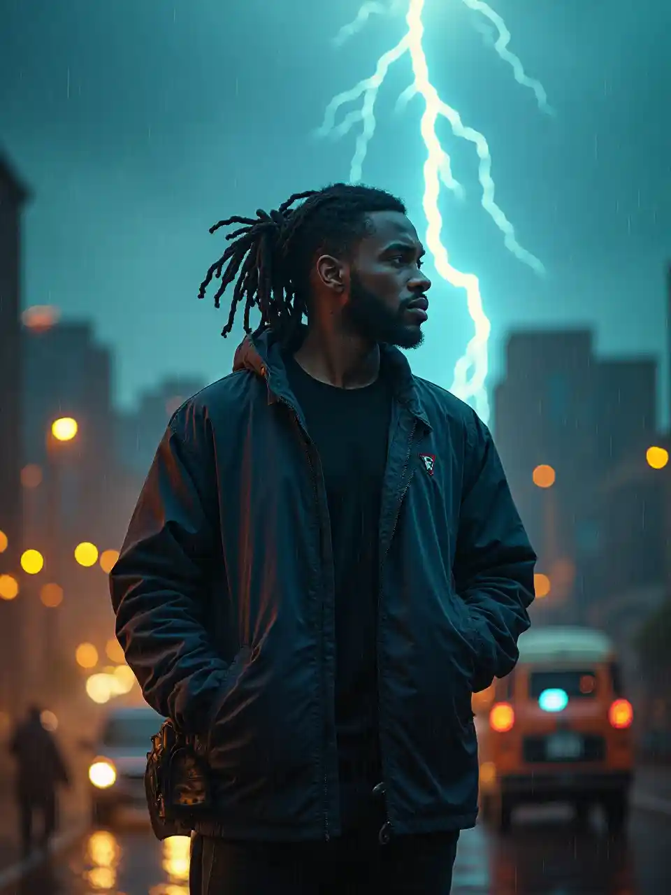 mtu mwenye dreadlocks amesimama mbele ya jengo na simu ya mkononi mkononi na mji katika background, Chinwe Chukwu-Roy, cubo-futurism, bado ya sinema, picha katika mvua na umeme
