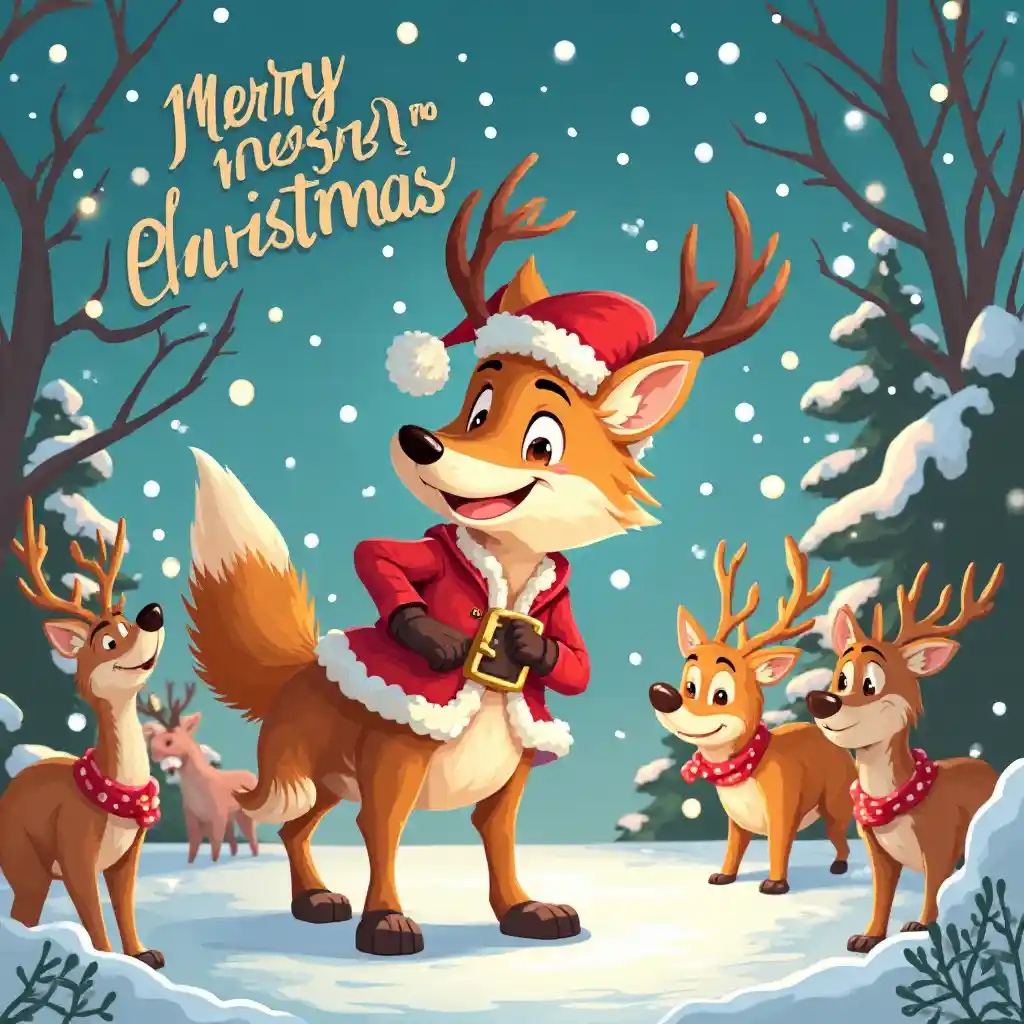 (kwa usahihi herufi "Merry Krismasi"), anthropomorphic coyote, watu wazima cartoon style, charming Krismasi eneo, rangi ya kupendeza, anga ya ajabu, mapambo ya sherehe, kuzungukwa na Santa's, maonyesho ya kucheza, background iliyofunikwa na theluji, vibes vyenye furaha, vipengele vya tabia, taa ya joto, picha ya ubora wa juu, muundo wa kuona.