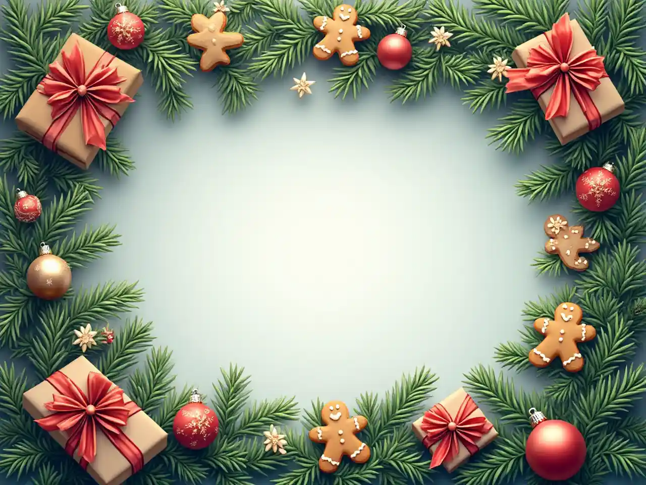 Mfano wa Krismasi Ulio na Matawi ya Mchiki. Pia kuweka Krismasi kuhusiana mipira, gingerbreads na zawadi masanduku mambo juu ya kubuni. Acha sehemu ya kati ya kubuni kubwa tupu ili niweze kuandika. juu