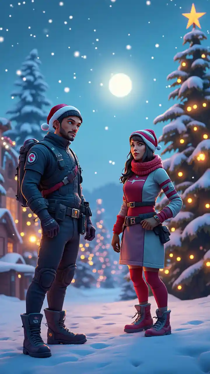 Coltenkadi ya Krismasi yenye furaha na kompyuta mpya ya kucheza. Fortnite wahusika kusimama karibu.