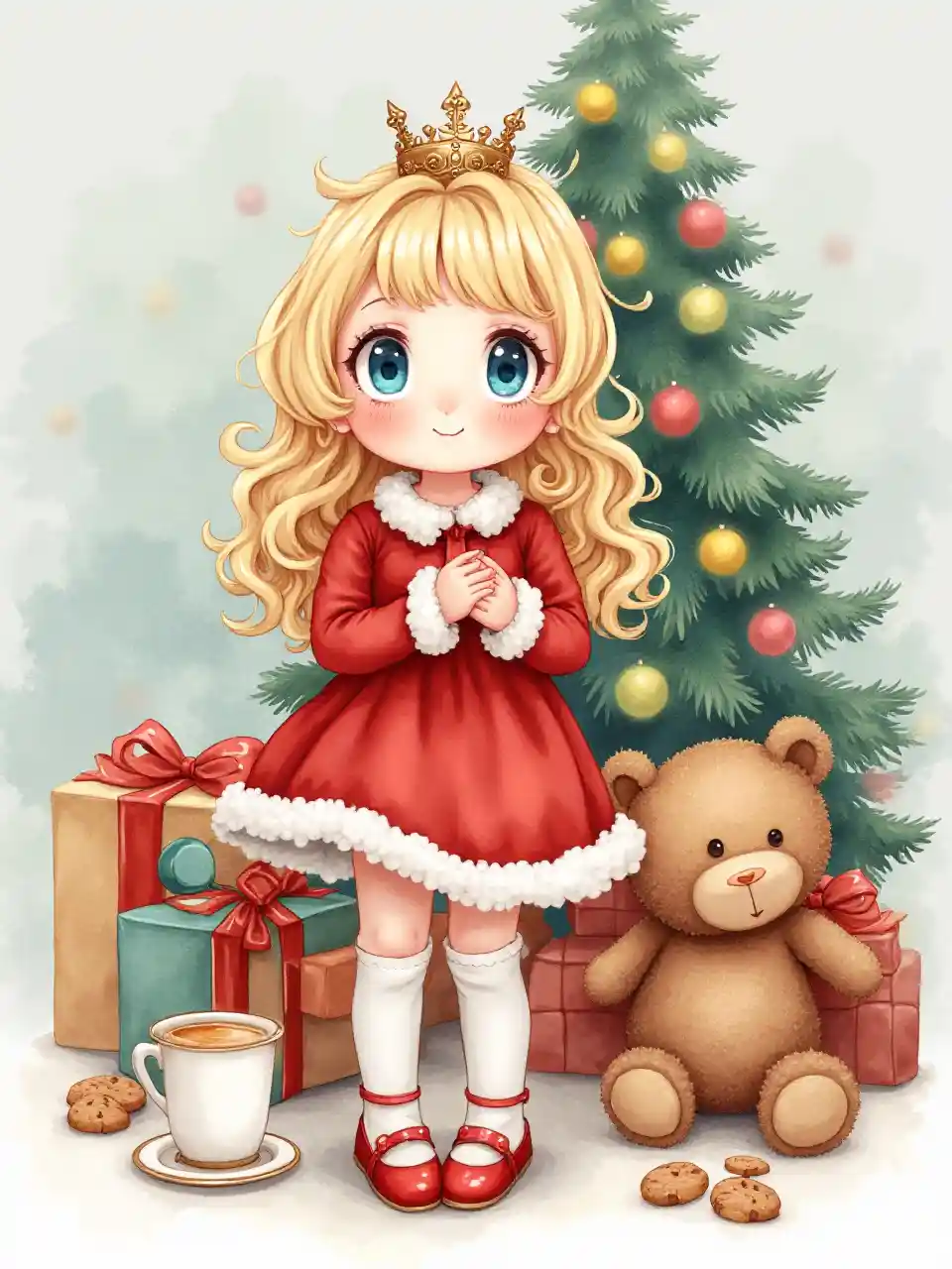 Alifanya picha ndefu ya maji ya msichana mdogo mwenye macho ya bluu, akiwa amevaa mavazi ya Krismasi mekundu, suruali ndefu nyeupe zenye kamba nyekundu na viatu vyekundu, akiwa na taji kichwani na nywele ndefu zenye nywele nyekundu. Karibu naye kuna dubu wa rangi ya kahawia, kikombe cha chai na biskuti. Nyuma yake kuna mti wa Krismasi na zawadi za Krismasi.