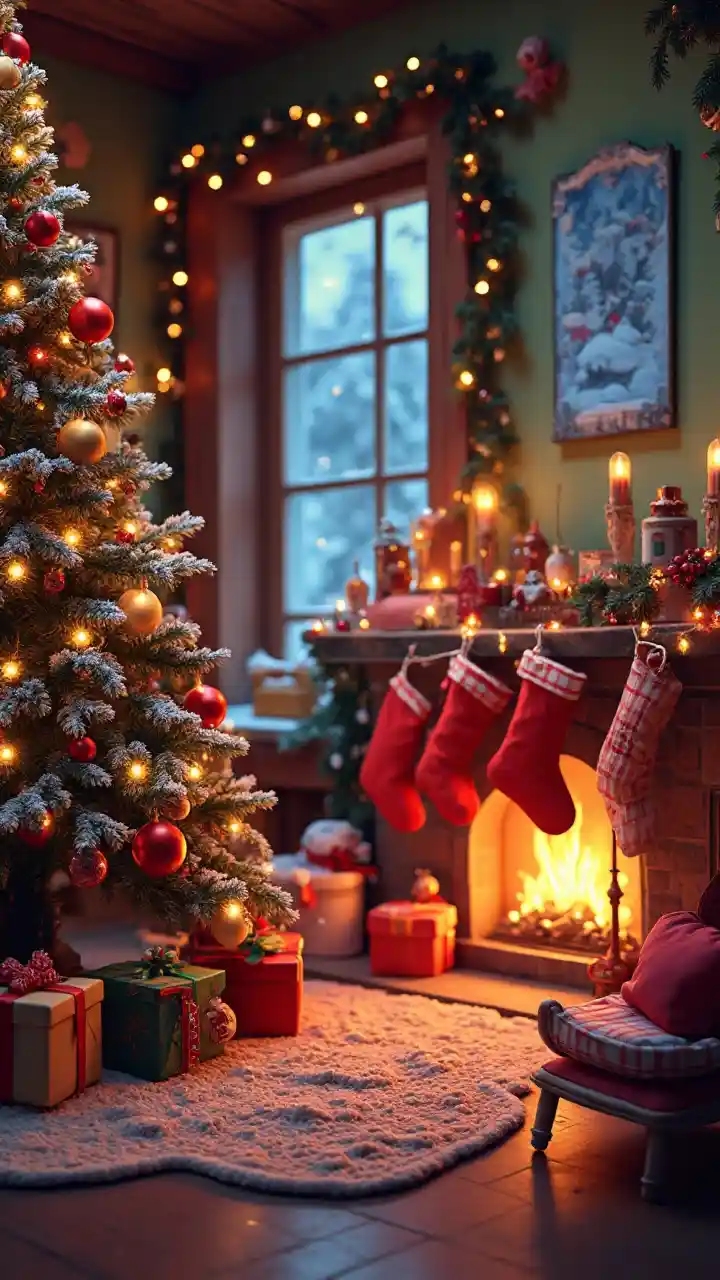 (chumba starehe Krismasi), cute decorated anga, rangi hai, taa sparkling, (theluji upole kuanguka nje), sherehe ya Krismasi mti, flickering moto mwangaza, rangi soksi kunyongwa, pipi kupamba chumba, joto na furaha anga, high-maelezo, 4K azimio, roho ya harmoni, mapambo nostalgic, kuwakilisha na furaha.