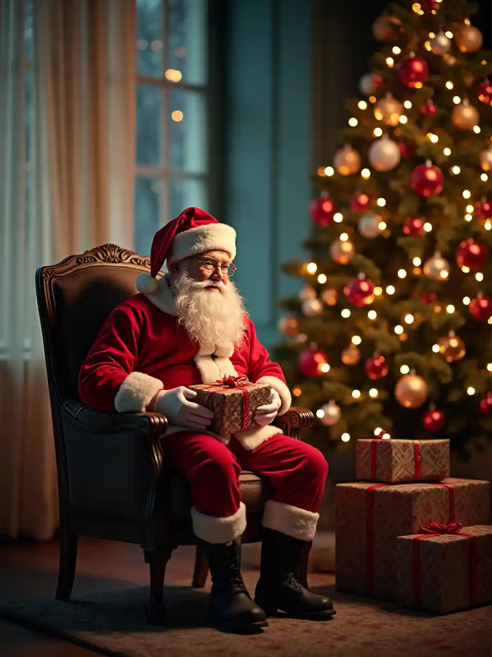 (Santa Claus), ameketi vizuri katika (kiti cha zamani cha mbao), kando ya mkali (mti wa Krismasi uliopambwa), akishika (zawadi zilizofungwa vizuri). Anavaa mavazi yake ya kitamaduni (nyekundu), akikazia rangi zenye nguvu za eneo hilo. Anga ni starehe na furaha, kujenga (hyper-kweli) anga na (tajiri maelezo), taa emphasized, evoking roho ya Krismasi katika stunning (ultra-detailed) 4K ubora.