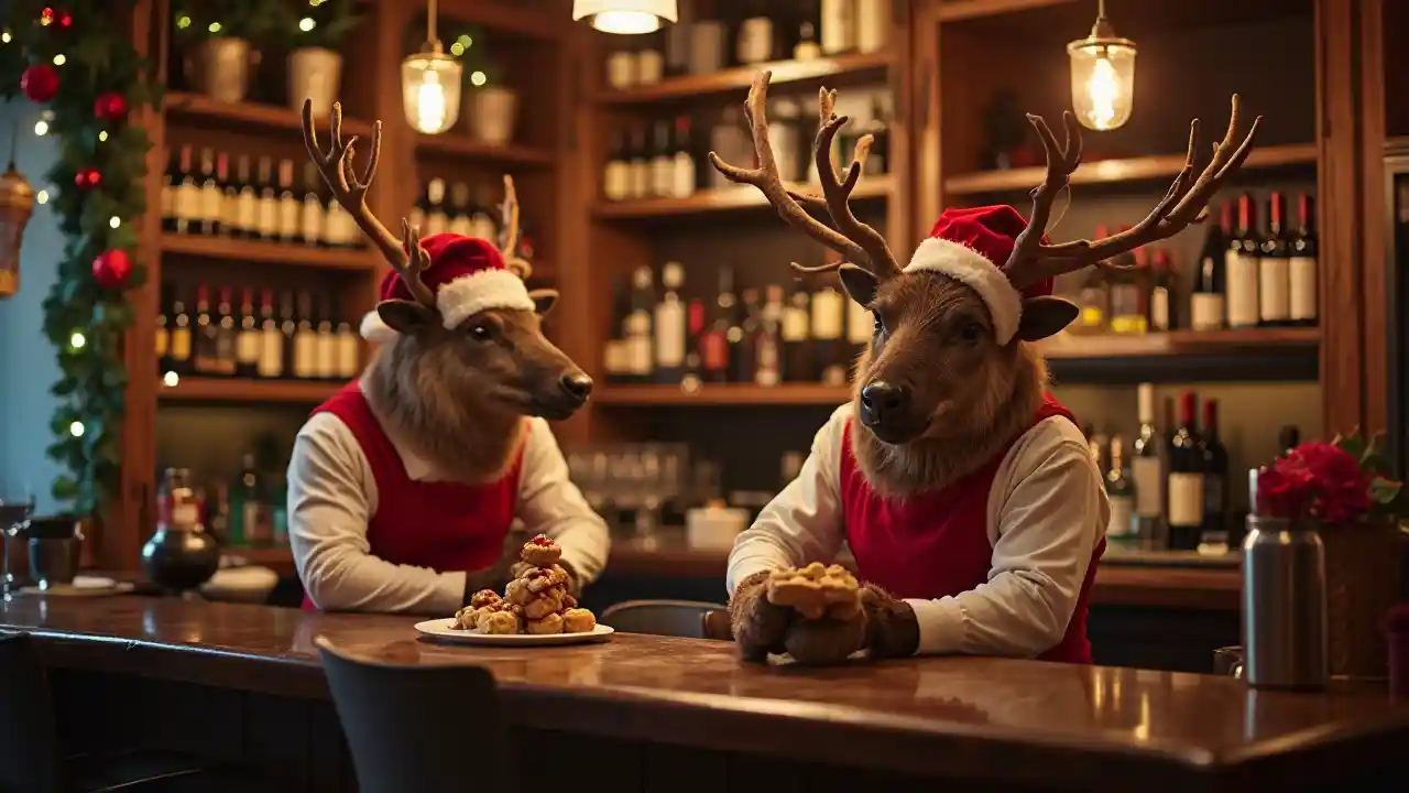 Mnyama wawili waliovaa kofia za Baba Krismasi wakitumikia nyuma ya meza ya divai usiku wa Krismasi