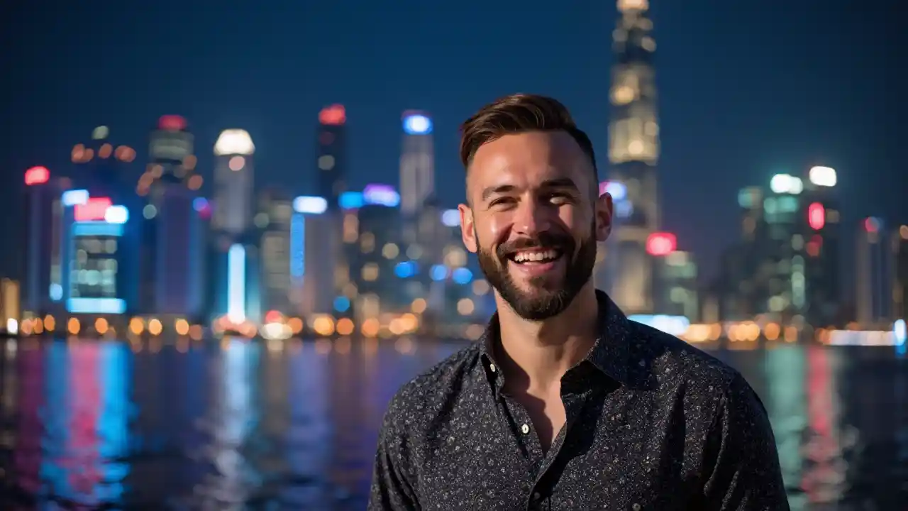 Mwanamume fulani mwenye tabasamu anasimama kwa uhakika juu ya mandhari yenye kupendeza ya jiji lililoangazwa na taa zenye rangi mbalimbali, akidokeza mandhari yenye kupendeza ya usiku. Ndevu zake fupi na nywele zake zilizopambwa vizuri zinaongeza utu wake. Nyuma, majengo ya kisasa ya kuinua anga yenye giza, yakiangaza maji yaliyo chini, na kuunda mazingira yenye kupendeza. Muundo wote unashikilia wakati wa furaha na uhusiano katikati ya mazingira ya mijini, na kupendekeza hadithi ya sherehe au kupumzika katika mji mzuri.