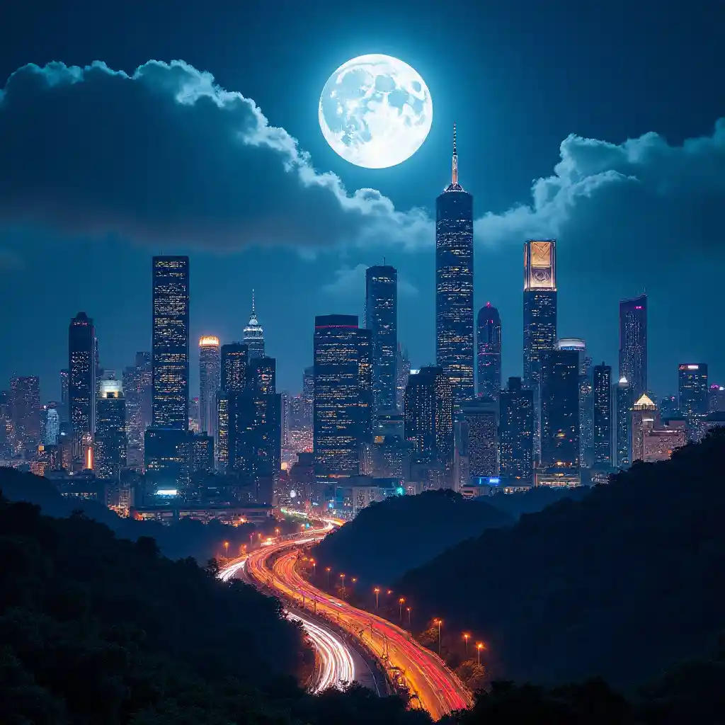 Mwezi kamili unaangaza kwa uangavu kwenye eneo lenye kuvutia la jiji, ambalo linaongozwa na majengo makubwa ya kujenga ambayo yanang'aa juu ya anga la usiku. Mawingu yanapita polepole karibu na mwezi, na hivyo kuongezea mandhari hiyo mambo ya kusisimua, huku majengo yaliyo chini yakitoa mwangaza kwa rangi mbalimbali, na hivyo kuonyesha ubora wa majengo hayo. Jiji hilo linaenea sana chini ya ardhi, na barabara zenye shughuli nyingi zinaangaza kwa njia ya mwangaza, na hivyo kuonyesha kwamba kuna mwendo na maisha ya usiku. Muundo huo unachanganya uzuri wa asili na hali ya kisasa ya mijini, na kuamsha hisia za kushangaa na utulivu katikati ya maisha ya mijini. Tofauti kati ya mwezi mkali na majengo yaliyoangazwa huleta hali ya kichawi, ikiwaalika watazamaji wajitumbukie katika mandhari hii ya usiku.