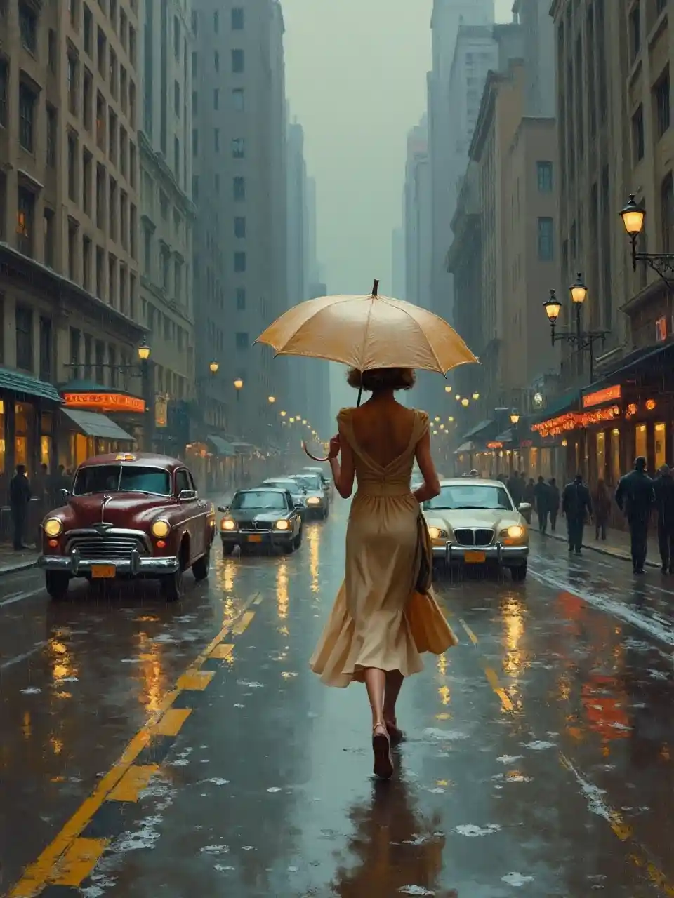 mwanamke katika mavazi kushikilia mwavuli kutembea katika mvua katika barabara ya mji na magari, Art Frahm, American eneo uchoraji, kinkade, sanaa deco uchoraji
