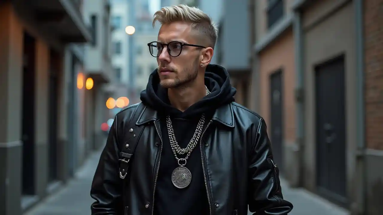 1. Main object (Character): A young man, about 25-30 years old. Short haircut with shaved sides, light bleached hair on top with textured styling. Oval face with light stubble emphasizing the contours. Round glasses in a thin black frame, tinted lenses. 2. Clothes and accessories: A black leather bomber-style jacket with cuffs and a slight sheen to the material. A black hoodie with a voluminous hood that slightly peeks out from under the jacket. A long silver chain with a massive round medallion around the neck. Silver accessories on the wrist: a massive watch and a bracelet. A black leather bag with a wide strap with metal elements (clasp, rings) on the shoulder. 3. Environment and background: A narrow city alley with an industrial atmosphere. The lighting is evening, with warm streetlights creating soft highlights on the jacket and accessories. In the background, you can see the gray walls of buildings, windows, and dim city lights. 4. Emotions and pose: The man is in a relaxed, confident pose, slightly turned in half profile. He looks into the distance, his face expresses calm and slight thoughtfulness. 5. Color palette: Dark, neutral shades: black, silver, warm highlights of lighting. Slight contrast with the muted gray color of the buildings in the background. 6. Details and textures: The texture of the leather jacket is clearly visible thanks to the highlights. The metallic shine of the accessories: the watch, the chain, the bag fittings. The matte surface of the hoodie and the soft folds of the fabric on the sleeves. 7. Angle and composition: The camera is positioned at the level of the character's chest, emphasizing his features. The composition is balanced: the main subject is in the center, the background serves as a complement.