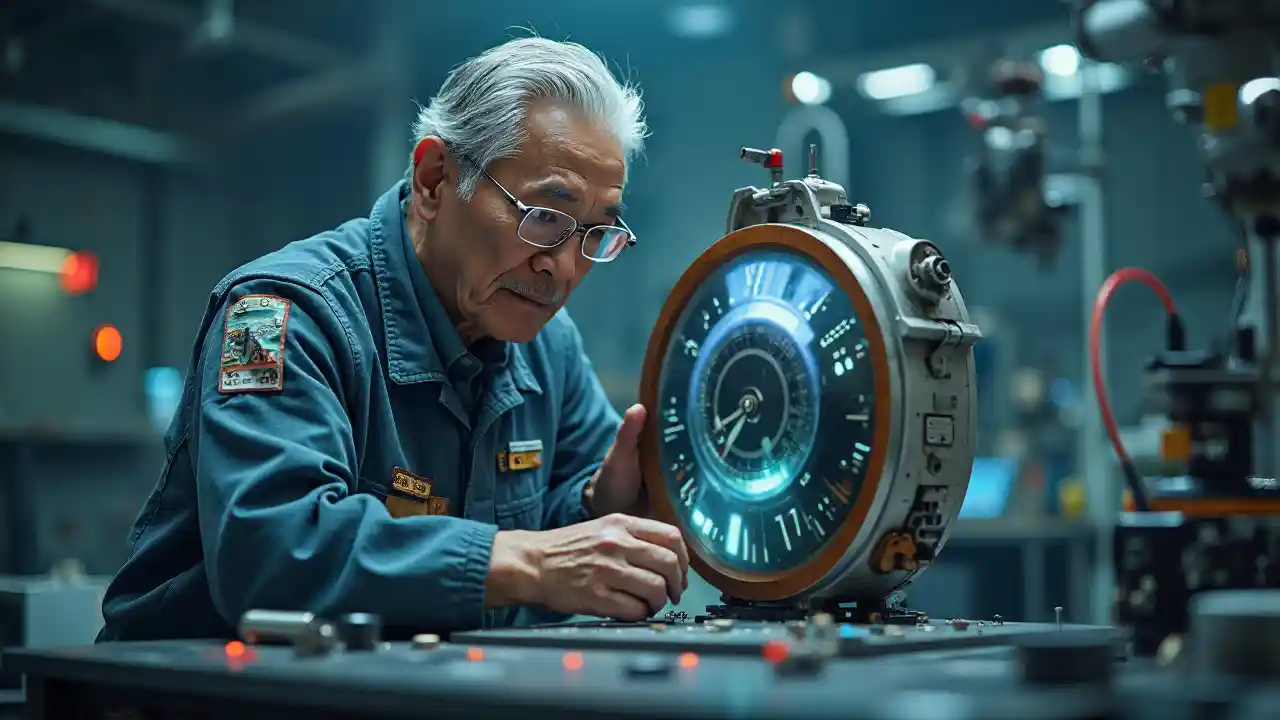 Akiwa akirekebisha saa katika karakana ya wakati ujao, mwanamume mmoja mwenye umri wa miaka 75 kutoka Asia Mashariki aliye na miwani anavaa suti ya mwili iliyo na vibandiko vya mzunguko. Vifaa vya hologramu na ndege wasio na kikosi wanaomshika, na mabadiliko yake ya akili yanaonyesha ubunifu katika ulimwengu wa teknolojia. Maoni yake huongoza wakati.