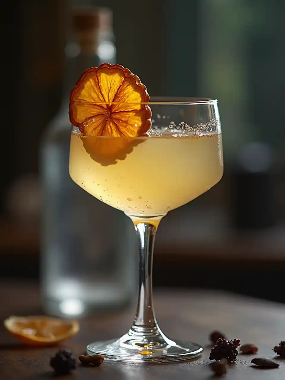 cocktail gin na kipande kavu cha matunda, kupiga picha ya kitaalamu chakula, kina cha picha, ajabu