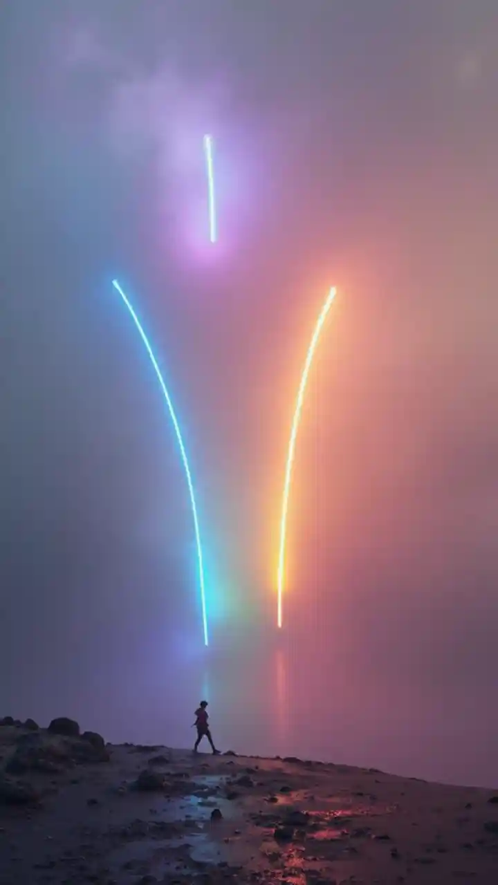 Prisma kubwa za saruji zenye rangi zenye kupendeza zikipita katika wingu nene sana na msingi wa kijivu