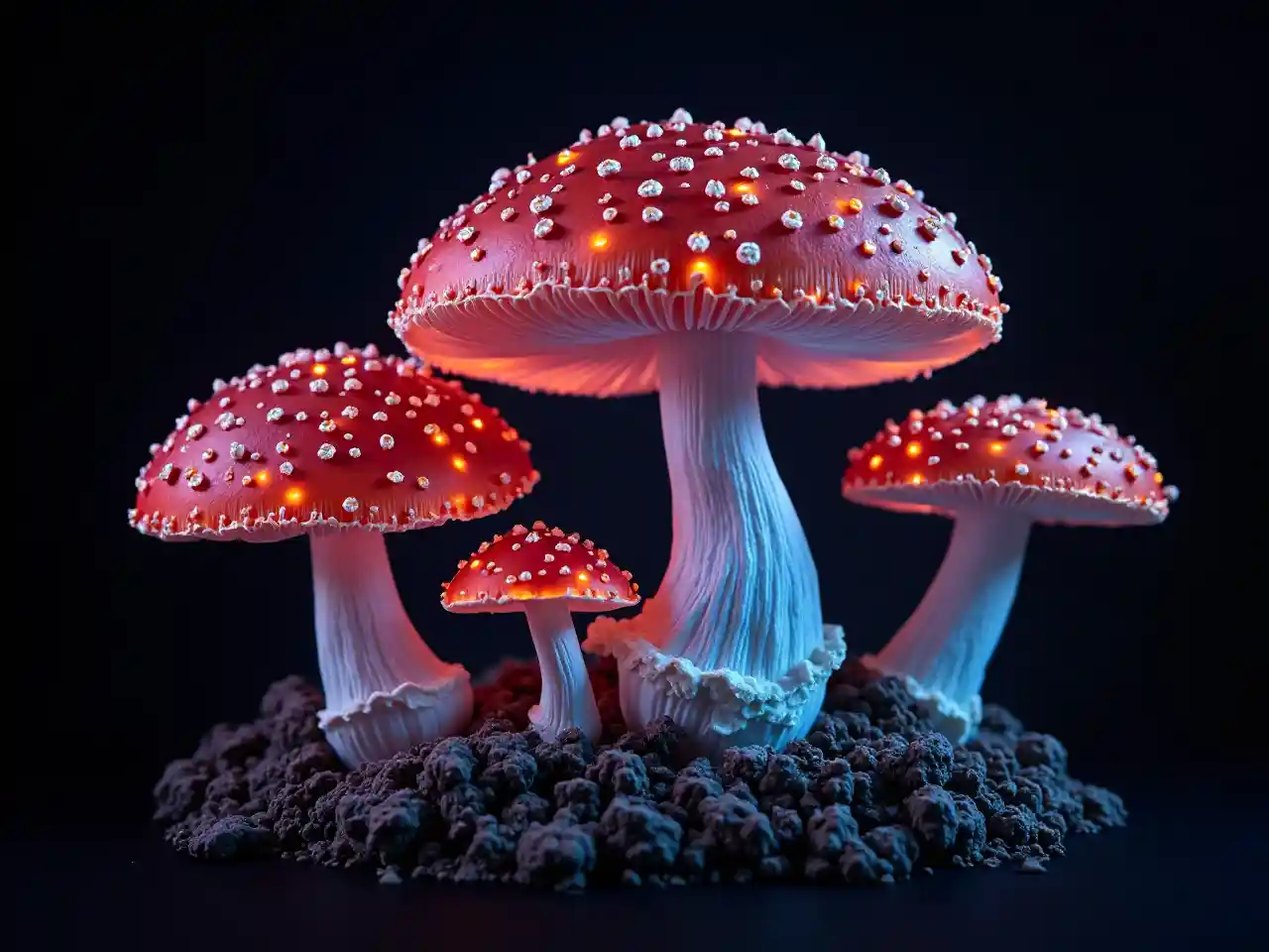 Uyoga wenye rangi nyingi wenye kung'aa kwenye mandhari nyeusi yenye maelezo mazuri