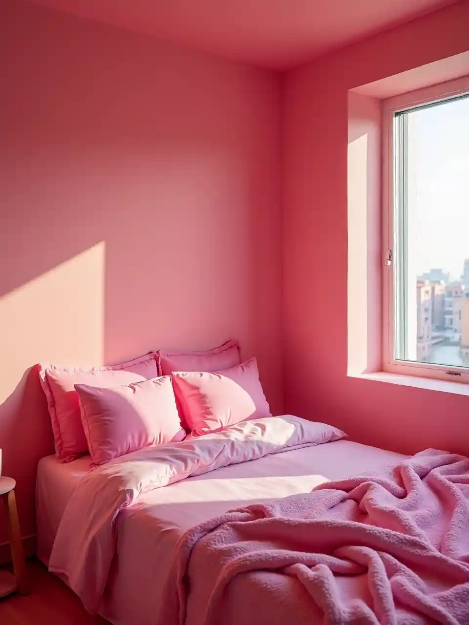 Peytonchumba cha kulala, kitanda na dirisha, mto na kitanda, rangi ya waridi, kitanda, madirisha, nafasi ya liminal, rangi mkali, aliongoza na usanifu wa Luis Barragan, kila kitu katika rangi mkali
