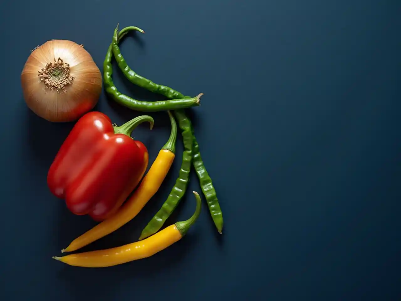 Scottnyanya nyekundu pilipili moto manjano mboga kijani vitunguu iko upande wa kushoto juu ya navy background minimalist rangi mkali utungaji sanaa