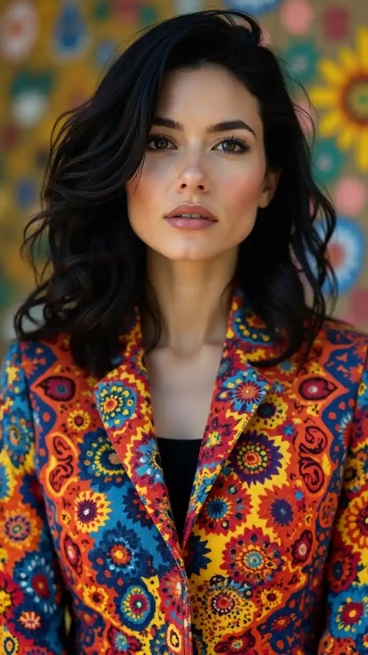 Picha ya mwanamke mwenye nywele nyeusi amevaa koti yenye miundo mkali, rangi ya tofauti, mtindo wa Yaacov Agam, rangi,