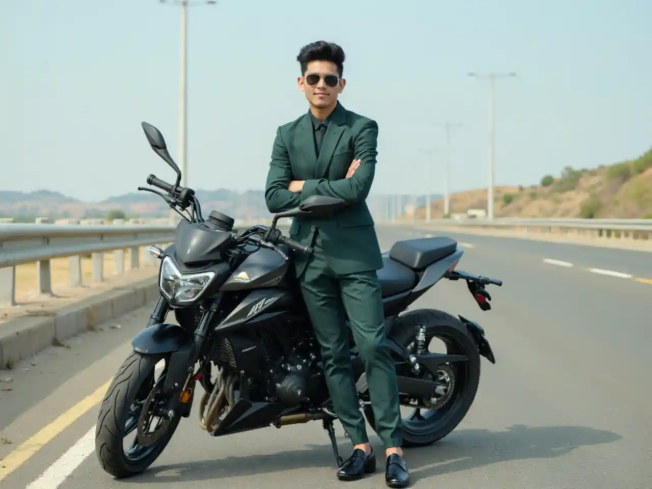 Kijana mmoja aliyevaa suti maridadi ya kijani kibichi iliyo na mitindo ya pekee, anajionyesha kwa uhakika kando ya pikipiki nyeusi yenye umbo la kupendeza kando ya barabara iliyo wazi. Vioo vyake vya jua vinaonyesha kwamba ana utulivu, na mikono yake ikiwa imefungwa inaonyesha kwamba ana utulivu. Mahali hapo panaonyesha siku yenye jua na anga safi, na hilo linaonyesha mandhari kubwa yenye mashamba na majengo yaliyo mbali. Mistari safi ya barabara na railing huweka picha, ikionyesha usawa wa mtu katikati ya hisia ya adventure, ikidokeza hadithi ya kutoroka kwa mtindo au wakati wa sherehe. Mavazi yenye kuvutia yanapoonyeshwa nje, watu hufurahi na kuwa na furaha.