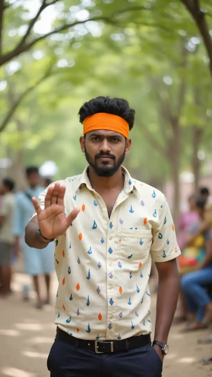 Mwanamume anasimama kwa uhakika nje, akiinua mkono wake kwa ishara ya kwamba anamsalimu mtu fulani au anaonyesha kwamba mtu fulani anamsikiliza. Anavaa shati la rangi nyepesi lenye michoro na almasi ndogo za rangi ya bluu na rangi ya machungwa, na pia suruali nyeusi. Kilemba chake cha rangi ya machungwa kinaongeza rangi yenye kupendeza, na kuonyesha jinsi anavyoonekana akiwa na wasiwasi anapomtazama moja kwenye kamera. Mahali hapo pana miti isiyoonekana wazi na majengo fulani, na hilo linaonyesha kwamba kuna mazingira ya kawaida, na jua linapenya majani, na hivyo kuunda mazingira yenye furaha. Maono yote yanaonyesha kwamba mtu huyo ana nguvu na anazungumza waziwazi, na hivyo watu wanataka kujua nia ya mtu huyo.