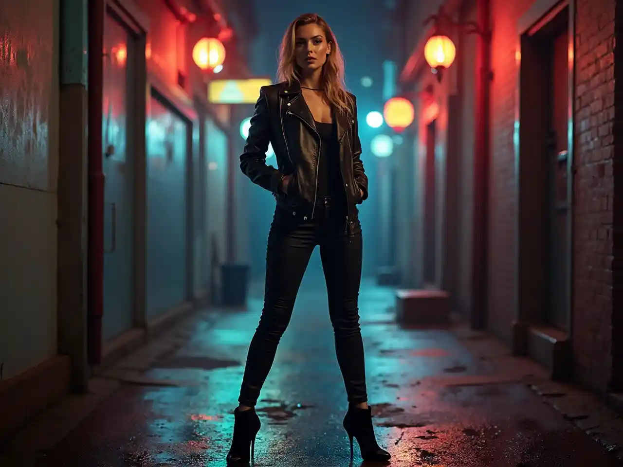 Wazia mwanamke mrembo aliyevaa koti nyeusi lenye ngozi, suruali nyeusi, na viatu vya visigino, akiwa amesimama kwa uhakika katika kijia chenye mwangaza mdogo na taa za neoni zinazoangaza kwenye barabara zenye maji.