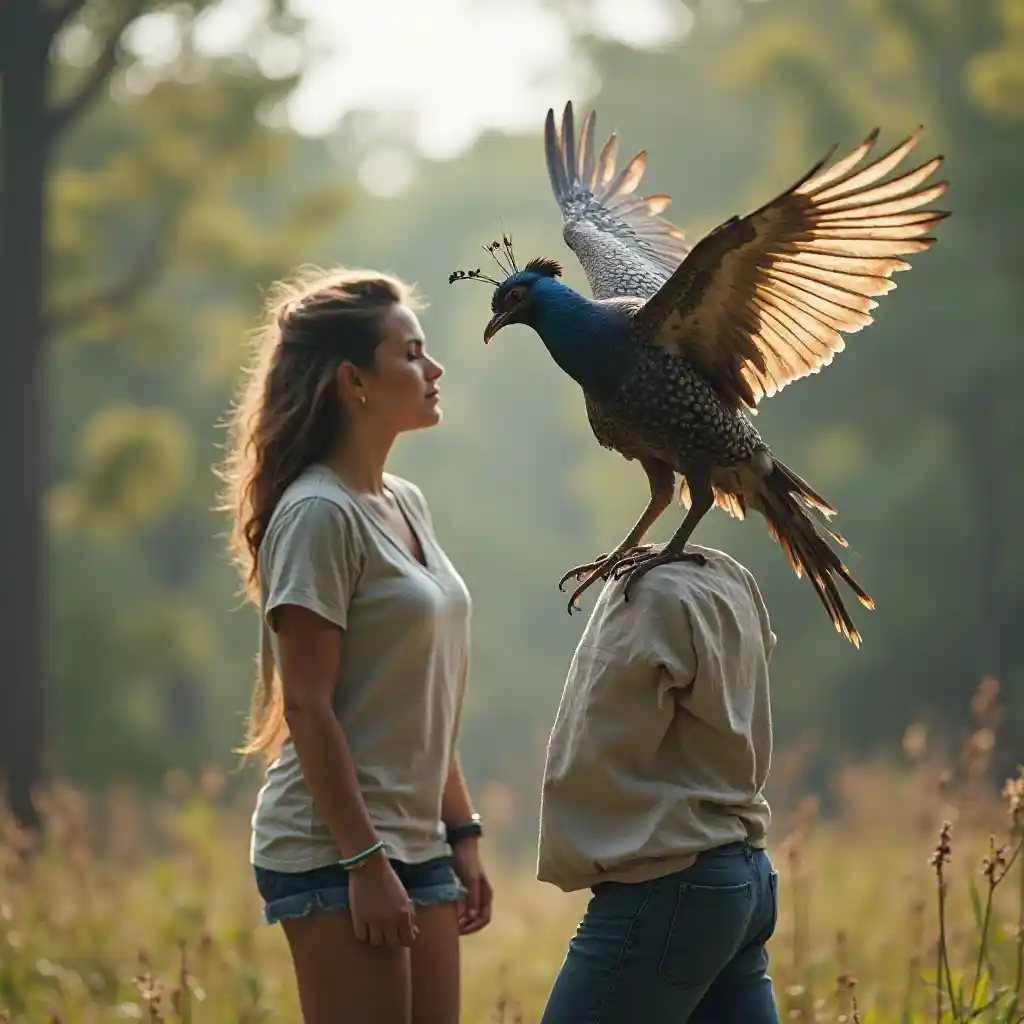 Mwanamke huyo anatembea kwa uhakika, na ndege huyo anapopanda, anamkaribia huku akitazama upande wa kushoto na wa kulia, na kutua juu ya mabe ya mwanamke huyo.