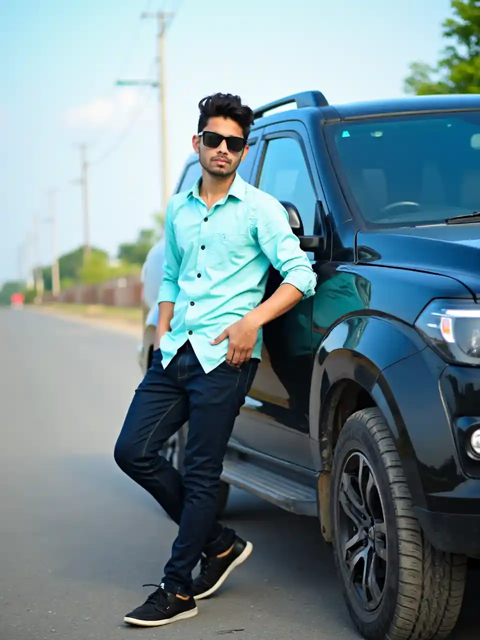 Kijana aliyevaa shati la bluu nyepesi na suruali nyeusi, akiwa amesimama kwa uhakika kando ya gari la aina ya SUV, anajifanya kuwa hajui, na mkono wake umegonga gari. Miwani yake ya jua yenye rangi nyeusi inaongeza utulivu, naye anatazama kamera kwa uhakika. Nyuma ya eneo hilo kuna anga safi na vijani na nguzo za umeme, na hilo linaonyesha kwamba kulikuwa na utulivu nje, labda kwenye barabara. Nuru ya jua yenye kung'aa huonyesha umbo la gari na mavazi ya mtu, huku umbo la jumla likilinganisha umbo na gari, na kuonyesha kiburi na mtindo. Mandhari hiyo inaonyesha wakati ambapo vijana wanajiamini, hali hiyo ikiwa yenye utulivu na yenye kusisimua.