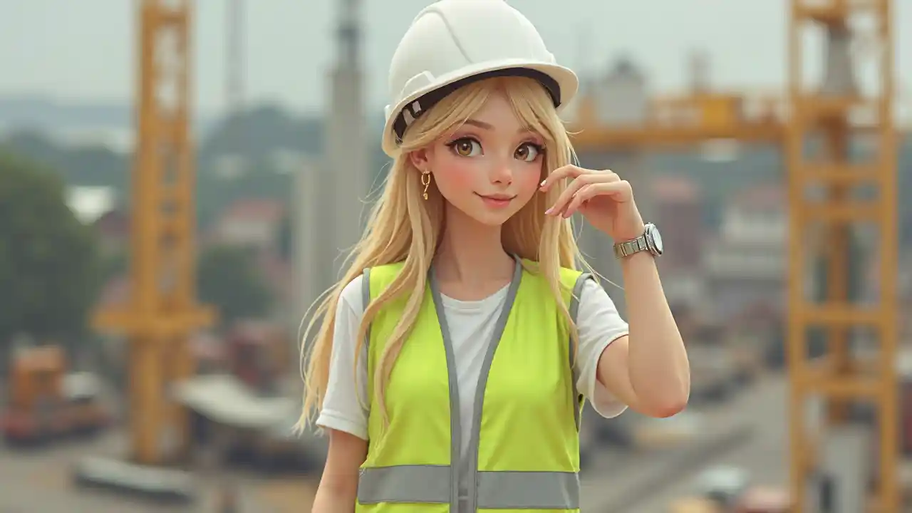 moja blonde nywele msichana macho kahawia, na nyeupe ujenzi kofia, kijani ujenzi kazi reflective vest, pete za dhahabu, fedha saa katika mkono wa kushoto, nyeupe pana pants na viatu nyeupe, na ujenzi background, mtindo carton