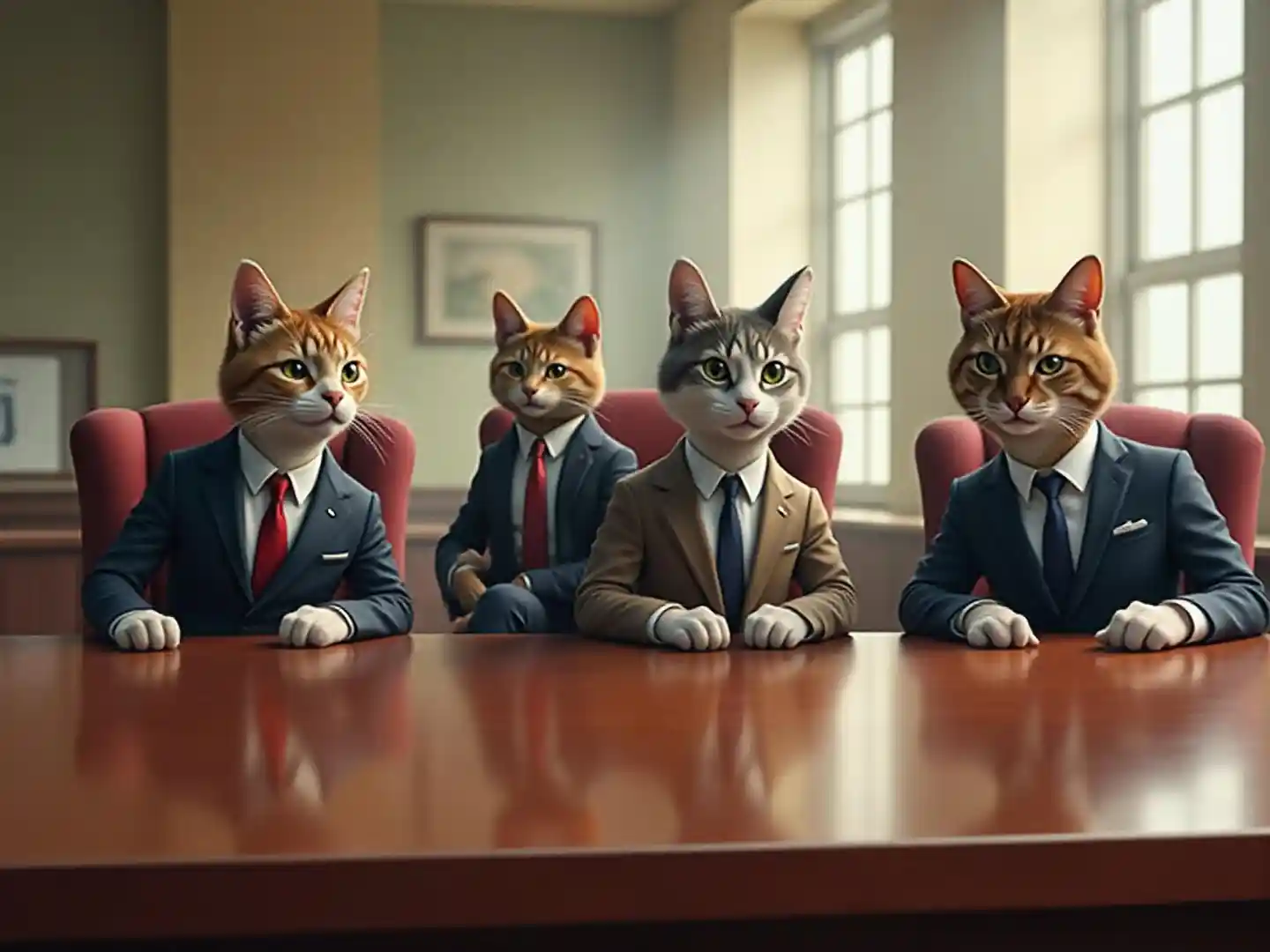 "Kundi la paka wa kibiashara wenye tabia ya kibinadamu wanaoketi kuzunguka meza ya mkutano ya mbao ya kijani-kibichi katika ofisi ya kampuni ya juu. Wao ni amevaa katika