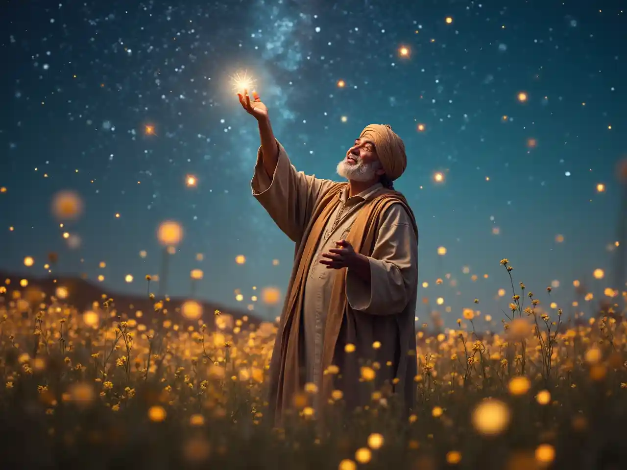 Akikamata nyota katika nyanda zenye kung'aa, mwanamume wa Mashariki ya Kati mwenye umri wa miaka 80 akiwa na turban, anavaa vazi lenye vipande vya nyota. Maua ya porini na anga lenye nyota humweka katika mazingira mazuri, na vipande vyake vyenye upole hutoa mshangao na shangwe ya kipekee katika mazingira ya ndoto. Macho yake huonyesha ulimwengu.