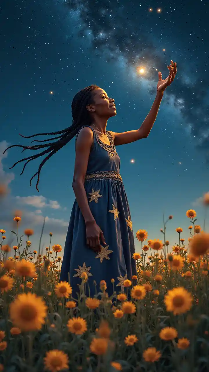 Akishika nyota katika nyanda zenye kung'aa, mwanamke wa Afrika mwenye umri wa miaka 73 mwenye mikunjo huvaa mavazi yenye mikunjo ya nyota. Maua ya porini na anga lenye nyota humweka katika mazingira mazuri, na vipande vyake vyenye upole hutoa mshangao na shangwe ya kipekee katika mazingira ya ndoto. Macho yake huonyesha ulimwengu.