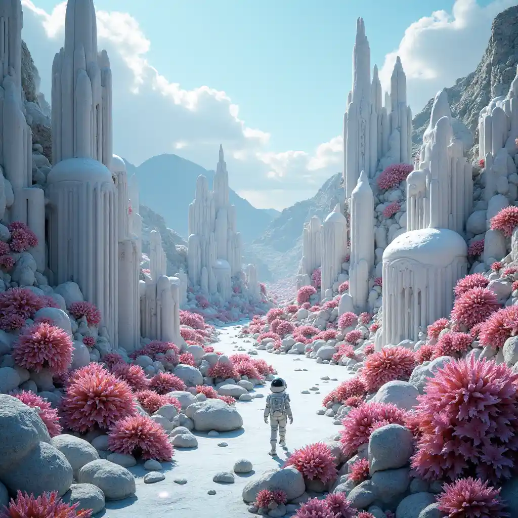 Makazi ya wanadamu kwenye sayari isiyojulikana yana majengo meupe yaliyo na rangi nyingi na yenye kupendeza. Mazingira hayo yamejaa mimea inayoangaza kwa njia ya ajabu, na hivyo kuunda mazingira mazuri. Miundo hiyo ina mambo mengi sana, na ina michoro ya rangi ya kijani-kibichi na uso wa kioo unaoonyesha mwangaza wa dunia. Katikati ya uzuri huo wa ajabu, mwanaanga wa pekee huchunguza eneo hilo. Mandhari hiyo ni kama ndoto, na mara kwa mara lenzi huangaza nuru. Licha ya mambo madogo-madogo, baadhi ya vitu vinaonekana kuwa visivyo kamili, na vile vina kasoro ndogo na maumbo yasiyo ya kawaida ambayo huongeza msukumo wa kisanii kwenye mazingira.