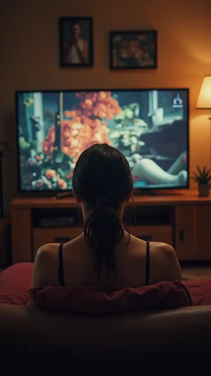 Victoriamtu ameketi kwenye kitanda na kuangalia televisheni kujaribu kubadilisha kituo