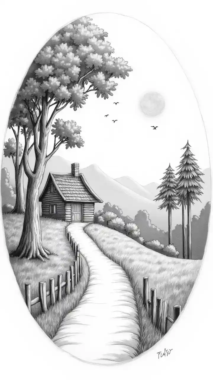 Hapa ni ombi kulingana na picha: * "Mchoro wa rangi nyeusi na nyeupe wa mandhari ya kijijini yenye amani ndani ya sura ya mviringo. Njia yenye kugeuka-geuka inaongoza kwenye nyumba ndogo yenye starehe yenye paa lenye kupindika na dirisha moja. Bonde la mbao huzunguka barabara, likijipinda kwa upole. Mti mkubwa wenye kivuli kinachong'aa uko mbele, huku mitende mirefu na vilima vilivyo mbali vikiongeza kina cha mandhari. Mwezi au jua likiwa limejaa linaonekana angani, likiwa limefunikwa na matawi ya miti, na ndege wakipaa juu ya upeo wa macho. Ukifanya hivyo, picha hiyo itakuwa na utulivu na amani". * Niambie kama unataka mabadiliko yoyote!