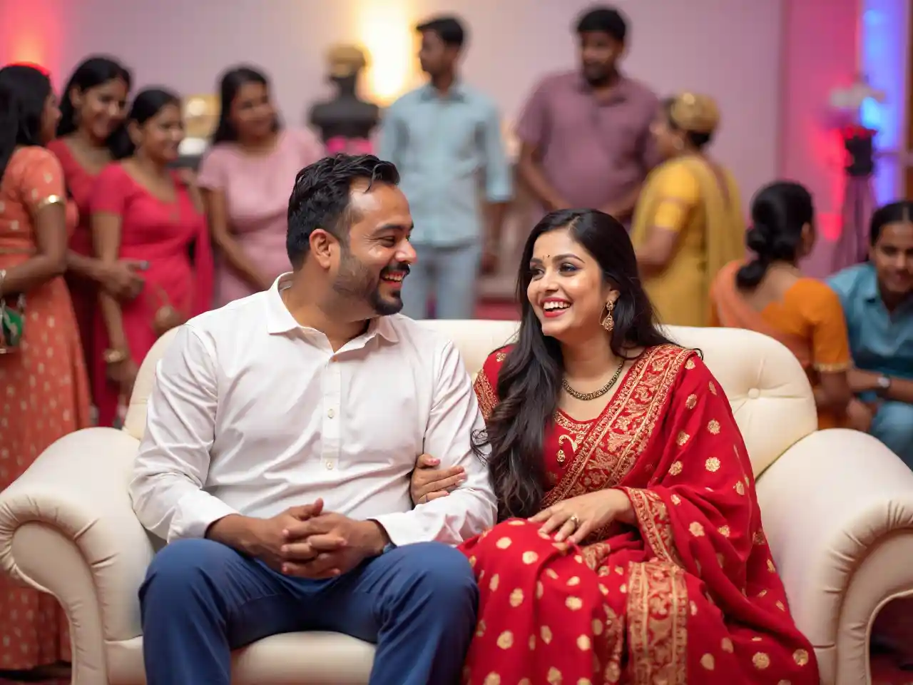 Katika jumba lenye kupendeza, lenye mapambo mazuri, wenzi wa ndoa wanakaa kwa starehe kwenye sofa nyeupe yenye kupendeza, wakitoa hisia za joto na shangwe katikati ya hali ya sherehe. Mwanamume huyo, aliyevaa shati jeupe na suruali za bluu, anatabasamu kwa furaha akiwa karibu na mwanamke aliyevaa sari nyekundu yenye kupendeza, na uso wake unaonyesha furaha na uzuri. Nyuma yao, wageni waliovalia mavazi ya kitamaduni yenye rangi mbalimbali wanazungumza kwa shauku, huku mwangaza wa juu ukiangaza mahali hapo, na hivyo kuongeza hali ya sherehe. Muundo huo unaonyesha uhusiano wa karibu wa wenzi hao na mazingira ya familia na marafiki, na hivyo kuunda hadithi ya kusherehekea na kuwa pamoja.