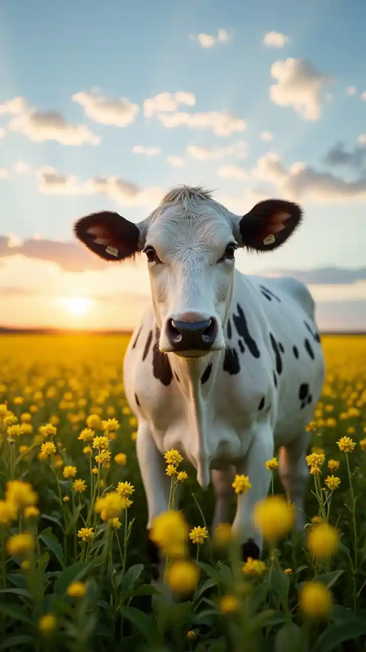 AdelineNg'ombe mweupe mwenye madoa meusi amesimama kwenye shamba la mbegu za mizeituni na mawingu meupe wakati wa jua
