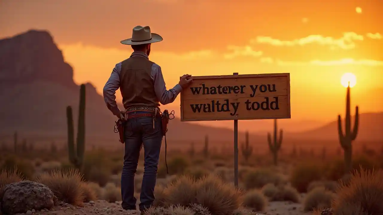 picha ya cowboy kushikilia ishara ambayo anasema "wote unataka cowboy Todd" spurs katika jangwa la Arizona, cacti na milima wakati wa kupumzika jua
