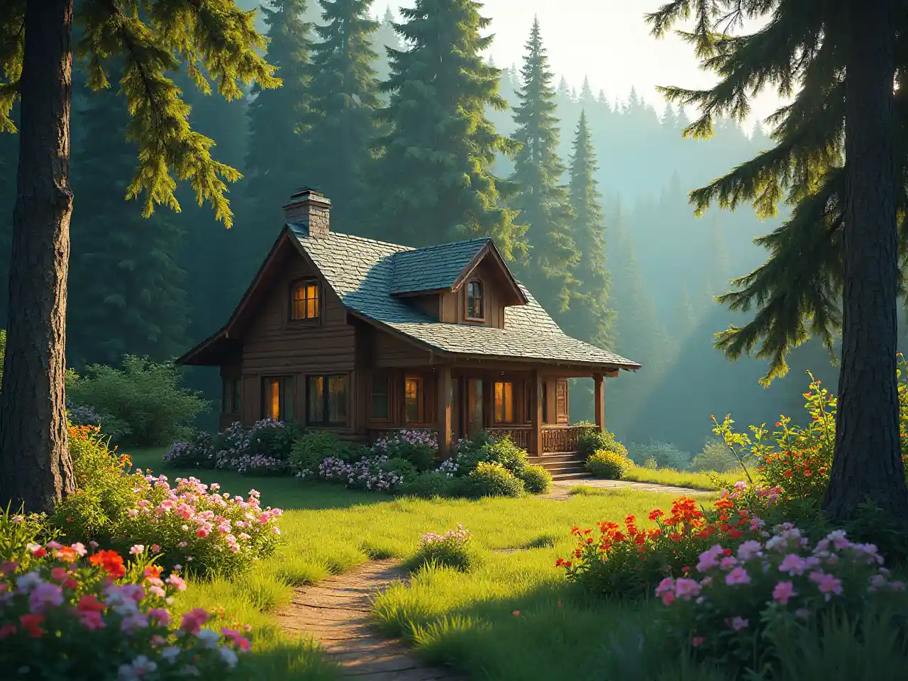 (cottage starehe), nestled katika msitu lush evergreen, vivutio maua ya porini, jua filter kupitia dense canopy, joto na kuwakaribisha anga, dappled jua kujenga vivuli playful, sauti laini tofauti na rangi mkali ya maua, utulivu na utulivu wa Pacific Kaskazini, kina kina mandhari, picha ya kuvutia, kuvutia uzoefu wa kuona.