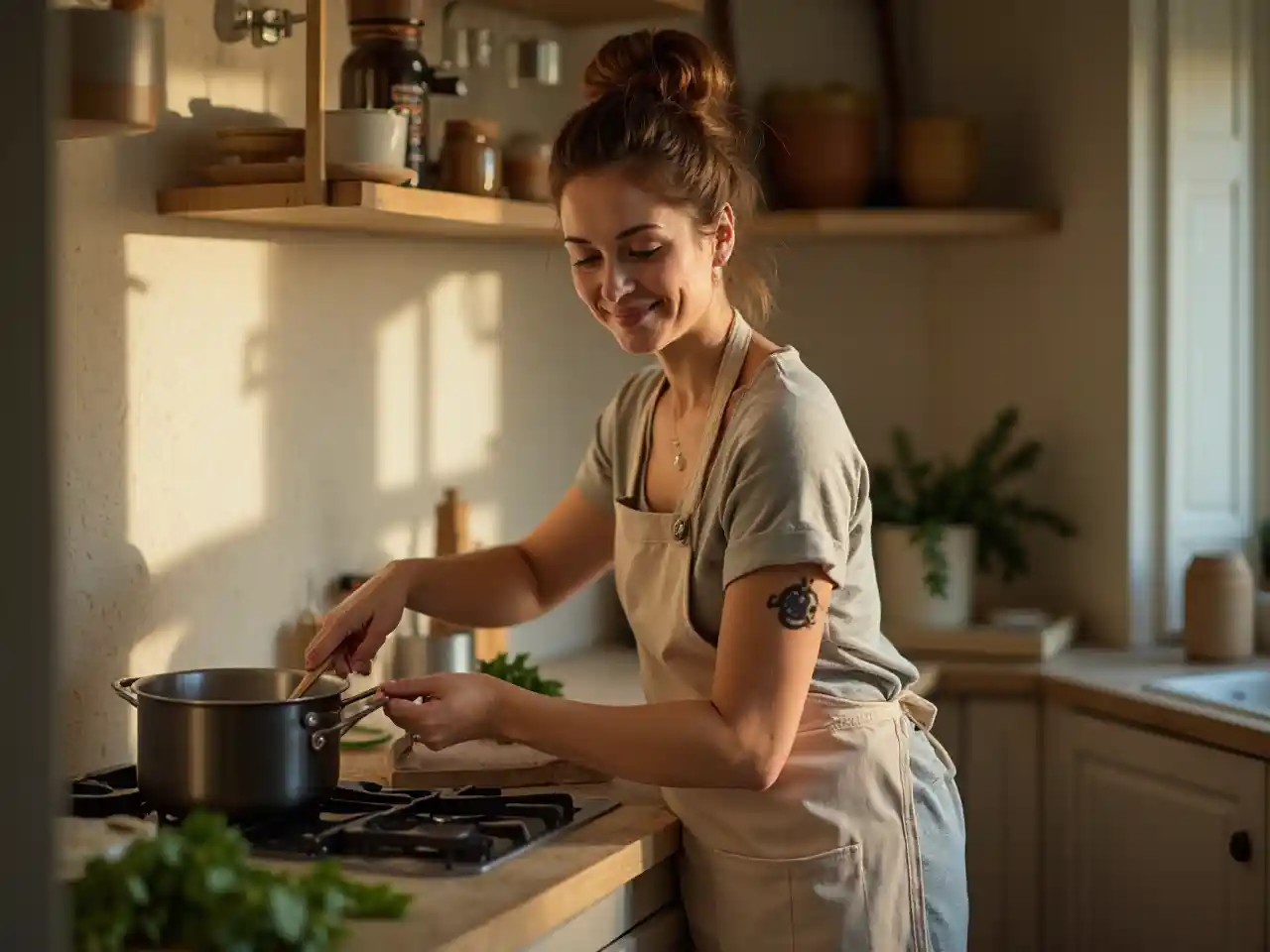 Mwanamke mwenye umri wa miaka 36 amesimama kwenye meza yake ya jikoni, akiwa amevaa aproni yenye kufaa juu ya sketi la pamba. Kifuniko hicho kina umbo rahisi lakini lenye kupendeza, na kuna mifuko ili kiwe rahisi. Anaenda kwa kasi, akiinama mbele kidogo huku mkono mmoja ukisogeza sufuria na ule mwingine ukirekebisha ubao wa kukata. Mwili wake ni wa utulivu lakini unazingatia. Uso wake umekaza fikira, na kipaji kidogo kwenye kipaji chake anapokula chakula hicho, midomo yake ikiwa imeinama na tabasamu ndogo ya kukubali. Nywele zake chache huondoka kwenye mkate wake uliopambwa, na kumfanya aonekane kama mtu asiye na maana. Nuru yenye joto kutoka jikoni huleta hali nzuri ya uchangamfu