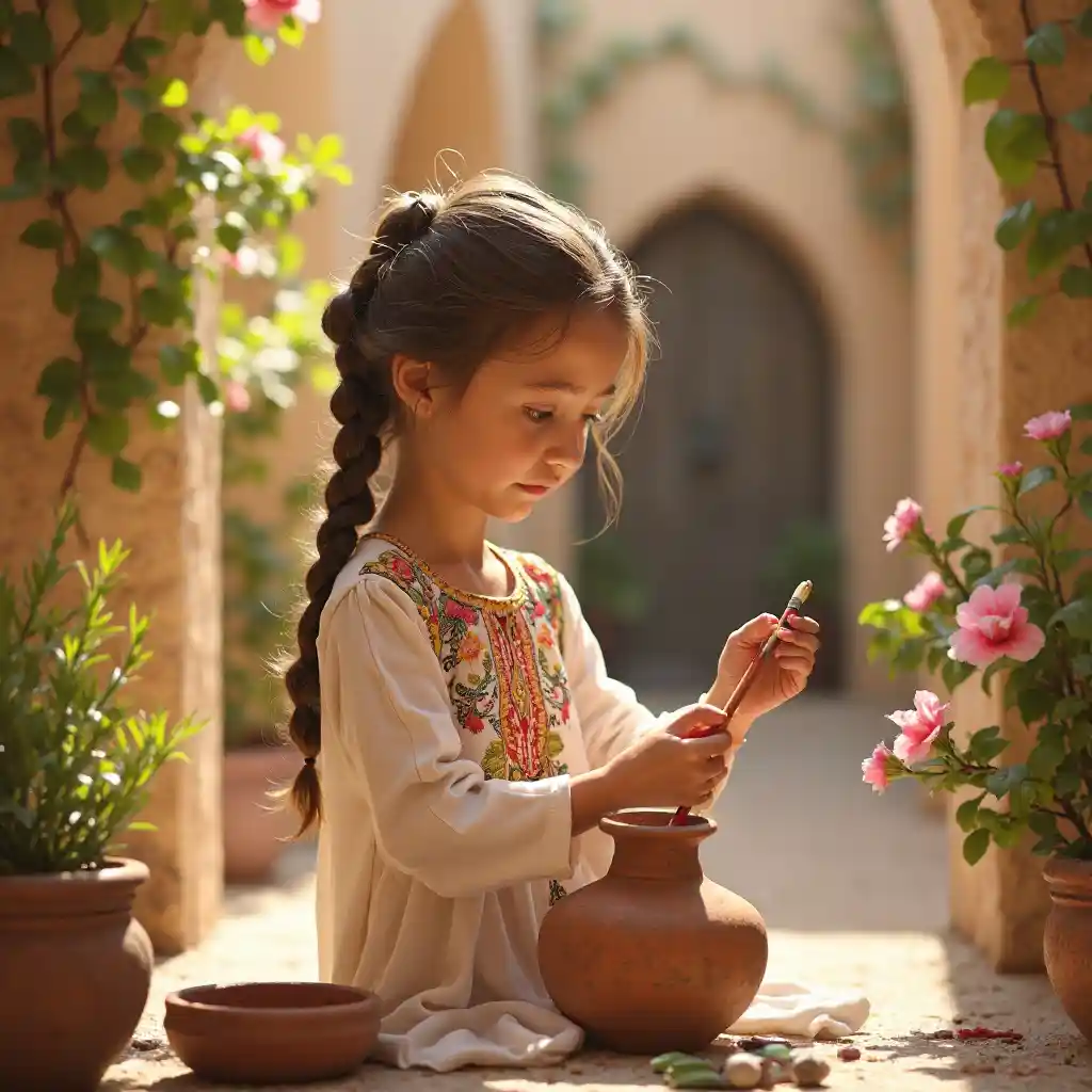Msichana mwenye umri wa miaka 8 kutoka Mashariki ya Kati mwenye mikunjo anachora sufuria kwenye ua ulioangazwa na jua, akiwa amevaa vazi lenye rangi ya maua. Maua yenye kupamba na matao ya mawe humweka katika mazingira yenye utulivu, na msumeno wake wenye uangalifu hutoa msukumo wa ubunifu na kuvutia kwa jua.