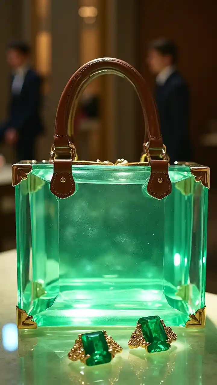 Mfuko wa glasi yaliyotengenezwa na kioo mwanga kijani na trim dhahabu na kushughulikia kahawia ngozi, aliongoza kwa mtindo wa Louis Vuitton na Prada. Picha za mitindo, matangazo ya bidhaa za kifahari, vito vya mapambo ya zambarau, mapambo ya kifahari. Mfuko wa mkono kwenye meza ya kuonyesha, azimio la juu.