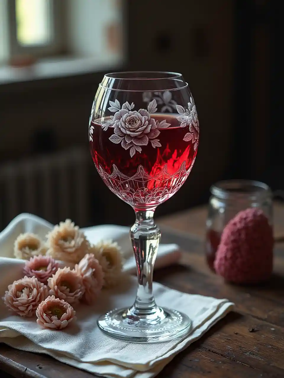 kioo kioo na mvinyo mwekundu, richly kuchorwa na maua, kioo juu ya meza ya zamani ya mbao na linen naperon, maua kavu juu ya naperon karibu na kioo, rangi laini, mwanga laini huja kupitia dirisha, giza mazingira, mazingira ya stare, kina sana