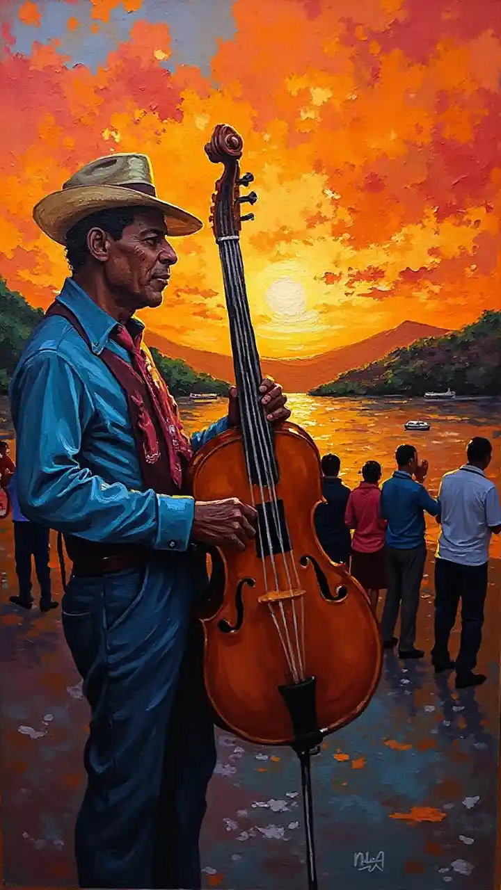 AlexanderPalette kisu uchoraji wa compai segundo (buena vista kijamii klabu) katika Cuba kucheza gutar katika machweo. saa ya dhahabu, rangi ya mafuta, karibu, sanaa, brashi nene, abstract