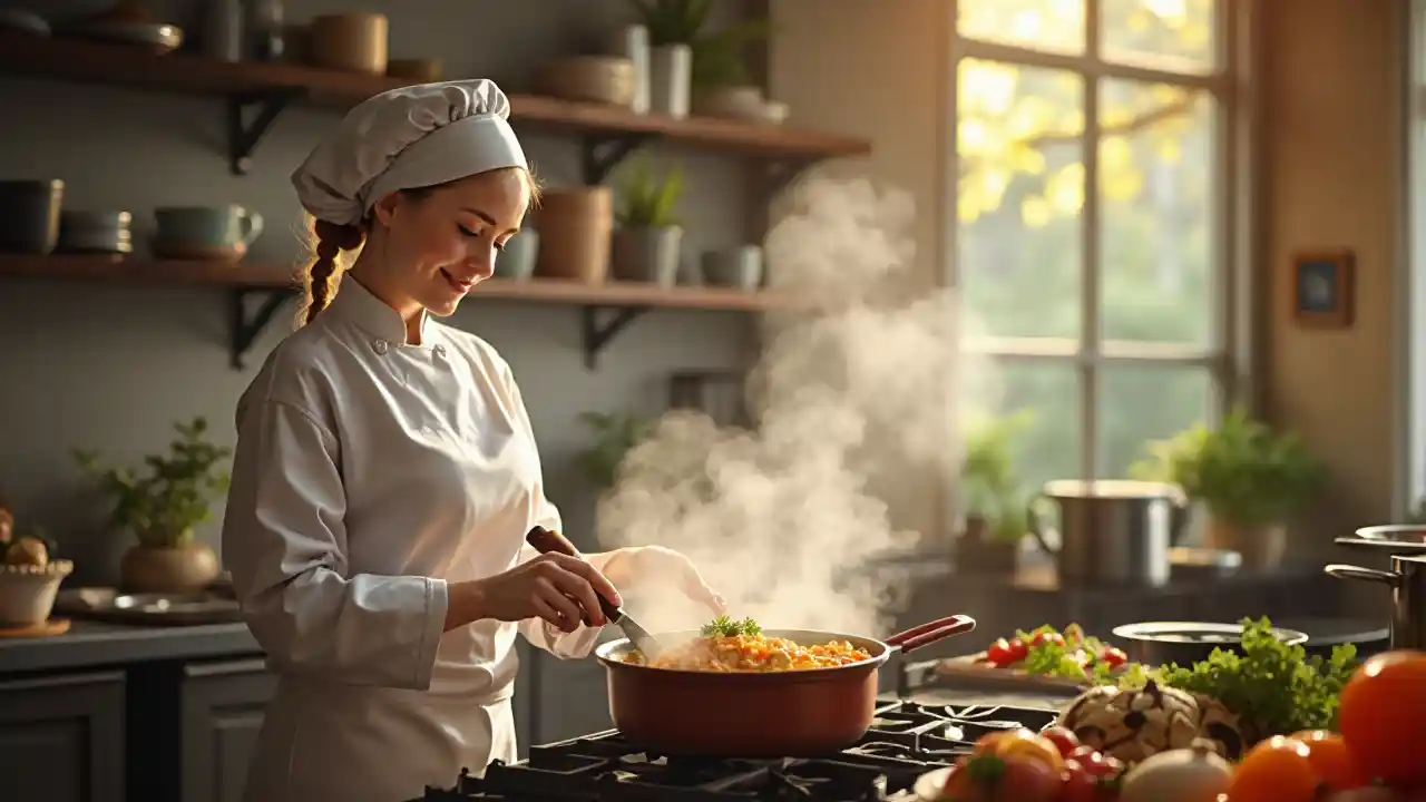 msichana mdogo na mzuri chef mkuu amesimama katika jikoni kubwa hoteli kuandaa chakula kitamu katika sufuria ya mvuke, kuzungukwa na sufuria, sufuria, viungo vya jikoni, siku ya jua, anga ya furaha, photorealistic