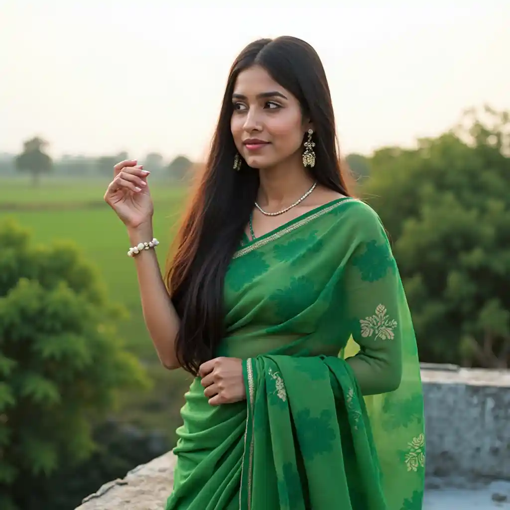 Akiwa amefunikwa na nuru ya asili, mwanamke kijana anasimama kwa uzuri kando ya paa tambarare, akiwa amevaa sare ya kijani-kibichi yenye rangi ya majani, ikichangana vizuri na kijani-kibichi. Nywele zake ndefu zenye rangi nyeusi zinashuka juu ya mabega yake, na vipuli vyake vyenye kupendeza na mkufu wake wa kawaida. Mahali hapo pana miti na mashamba yaliyo mbali chini ya anga safi, na hilo linakazia hali ya mapema jioni. Anajiweka kwa njia ya kufikiria, huku mkono mmoja ukimegemea kiuno, na hivyo kuonyesha kwamba ana uhakika. Mtazamo wa jumla wa mandhari ni utulivu na kutafakari, kusherehekea uzuri wa kitamaduni katikati ya mazingira ya utulivu.