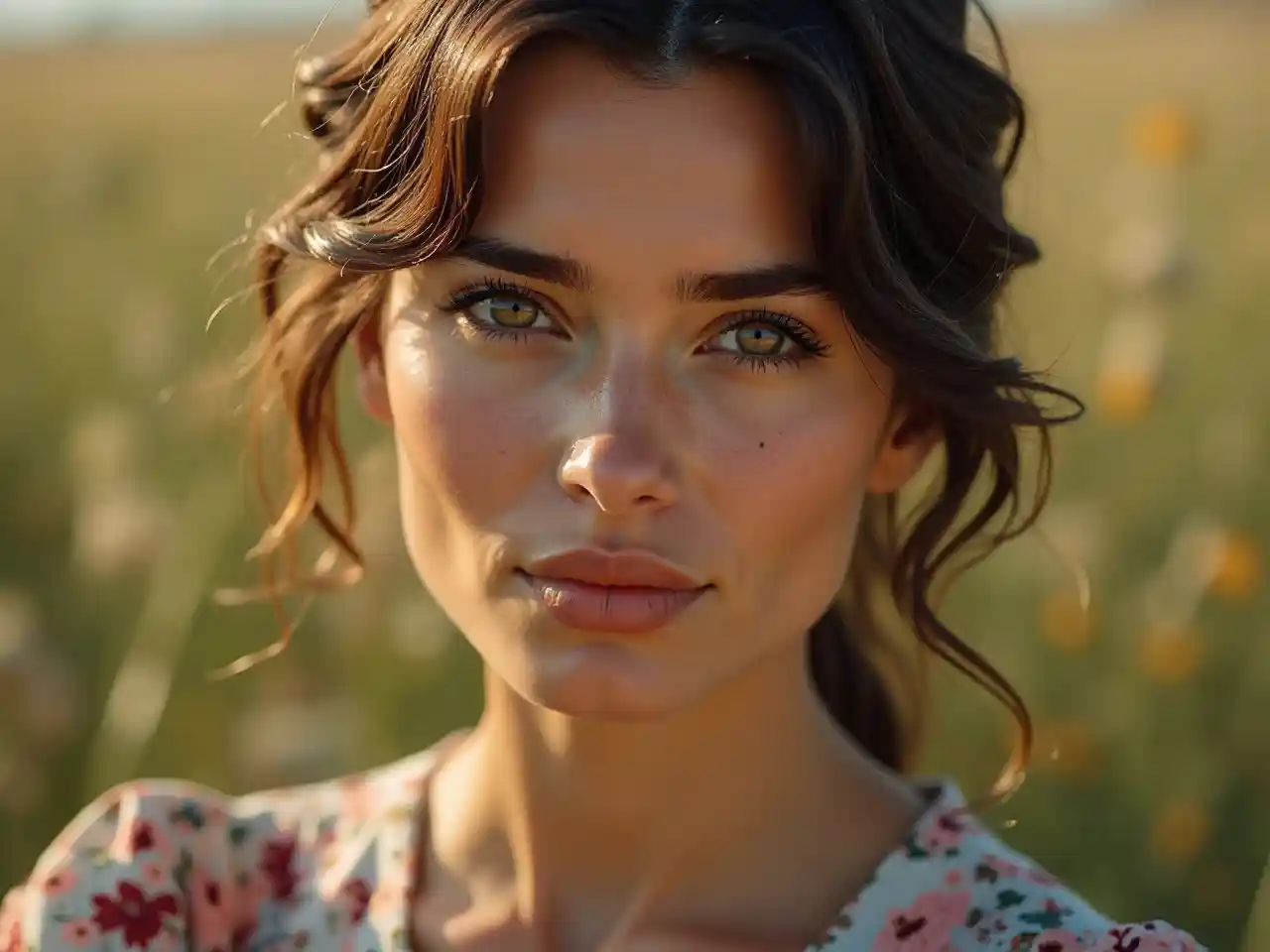 Picha ya karibu ya mwanamke wa Ulaya mwenye mchanganyiko wa ushawishi wa kitamaduni, katika blouse ya maua, iliyopigwa katika picha ya juu. Mazingira ya nje huongeza mambo ya ajabu na yenye kupendeza kwa nuru ya asili. Picha hiyo imepigwa picha kwa uangalifu, na hivyo kuonyesha macho yake yenye kueleza mambo kwa undani. Iliyochukuliwa katika 8k UHD azimio na Nikon D850, ina sauti ngozi hyper-kweli na filamu ndogo, kutoa texture lifelike.
